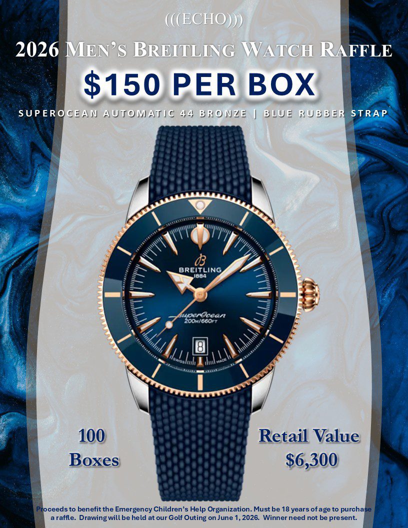 Enter our box board raffle to win a brand new Breitling Superocean Automatic 44 Watch in Bronze with blue rubber strap valued at $6,300. Boxes are $150 each and only 100 boxes will be sold. Please select your box board number using the form below. Winner will be selected live at our Golf Outing on June 1st. Winner need not be present. Those who purchase a box board number online will have their name written on the box board the day of the event.